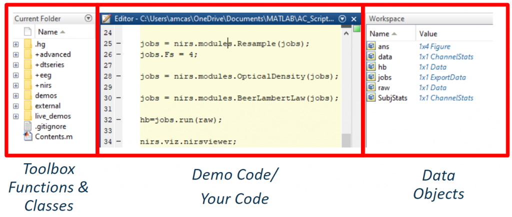 The NIRS Toolbox is a set of MATLAB-based tools (functions and scripts) and, hence, some prior experience in programming, and of MATLAB in particular, is advisable. A good starting point for those who are not familiar with this software would be watching some starter tutorials available on the MATLAB Support site. The basic workflow is similar to the one depicted in Figure 1 below: